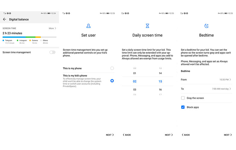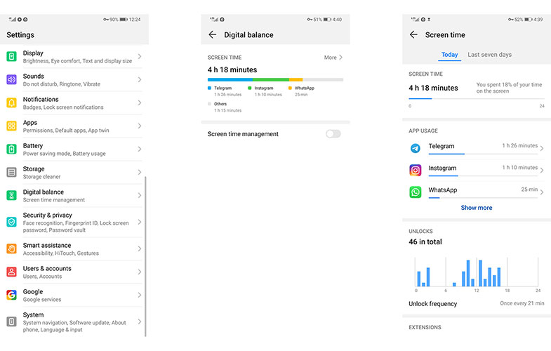 ویژگی Digital Balance با عملکردی کاملتر از Digital Wellbeing، درون رابط کاربری گوشیهای هوشمند هواوی قرار گرفته است. این قابلیت علاوه بر فراهم کردن امکان نظارت و مدیریتِ زمان صرفشده برای هر یک از نرمافزارها، برای والدین نیز دارای ویژگیهای نظارتی است.