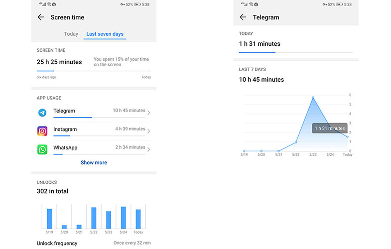 در این بخش با انتخاب گزینه More به اطلاعاتی نظیر مجموع زمان استفاده شده از دستگاه، زمان صرف شده برای هر نرم افزار و مجموع دفعاتی که دستگاه را آنلاک کردهاید در 2 سربرگ جداگانه به صورت روزانه و هفتگی در دسترس هستند.