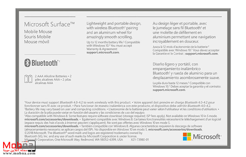 مجله آنلاین موبنا – اگر برای انتخاب یک ماوس خوب دچار مشکل شده اید؛ مایکروسافت یک گزینه مناسب برای کاربران عادی در کاتالوگ محصولات خود دارد. این محصول در ابعاد 1.42 در 3.48 در 5.3 اینچ تولید شده و سنگینی آن حدود 135 گرم است. این محصول نیز همانند سایر تولیدات مایکروسافت کیفیت ساخت بالایی دارد به نحویی که در اولین تماس ، مخاطب را درگیر خود می کند. با توجه به نامی که برای آن انتخاب شده یعنی “سرفیس موبایل” دقیقا از زبان طراحی محصولات خانواده سرفیس پیروی می کند و در سه رنگ متنوع شامل نقره ای، آبی کبالت و قرمز بورگوندی موجود است. با توجه به رنگ های مذکور به خوبی با سرفیس پرو، لپ تاپ سرفیس 2 و سرفیس گو هماهنگ می شوند.
