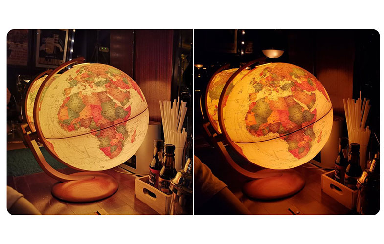 در طرف مقابل، حالت عکاسی در شب یک قابلیت مستقل بر روی گوشی Huawei P30 Pro است که امکان دستیابی به تصاویر واضحتر و نتایج بهتر را در شرایط نوری بسیار ضعیف میسر میکند. کافی است در مواقع نیاز این حالت را انتخاب کنید تا ظرف حداکثر 5 ثانیه، بتوانید عکس دلخواه خود را بگیرید. برخلاف سامسونگ، تأثیر این قابلیت چشمگیرتر است. در زیر تصویری از مقایسه قابلیت حالت عکاسی در شب هواوی را در مقایسه با گوشی سامسونگ مشاهده میکنید. لازم به ذکر است این قابلیت بر روی Huawei Mate 20 نیز یافت میشود که نتیجه آن در تصویر سمت چپ مشخص است.