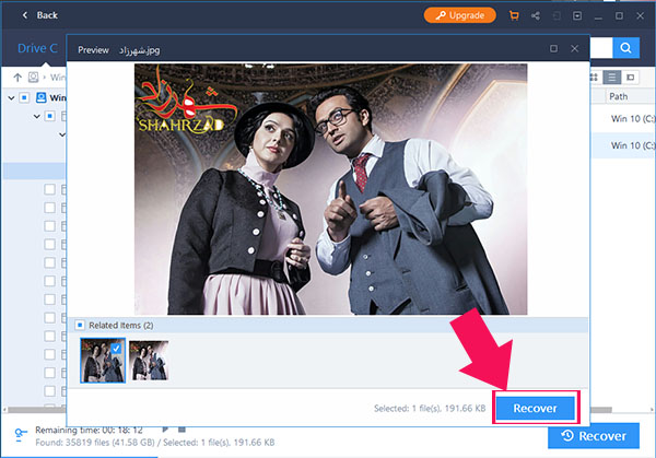 4.وقتی جستجو تمام شد روی فایل های پیدا شده می توانید کلیک راست نموده و Preview را بزنید با این کار پیش نمایش عکس را می بینید. در پایان زدن دکمه آبی ریکاور، فایل را بازگردانی می کند.