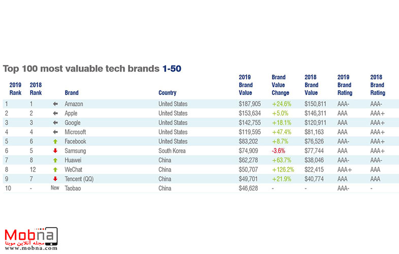 جایگاههای اول تا پنجم به ترتیب در اختیار برندهای آمریکایی آمازون، اپل، گوگل، مایکروسافت و فیسبوک قرار دارند و در رده ششم نیز سامسونگ قرار گرفته و البته تنها شرکتی است که رشد منفی داشتهاست. ضمنا در این رتبهبندی برند هواوی با کسب رده هفتم، جهشی خیره کننده با افزایش 63.7 درصدی در میزان ارزش برند به دست آورده است.