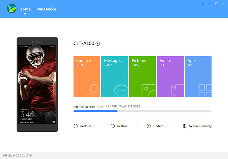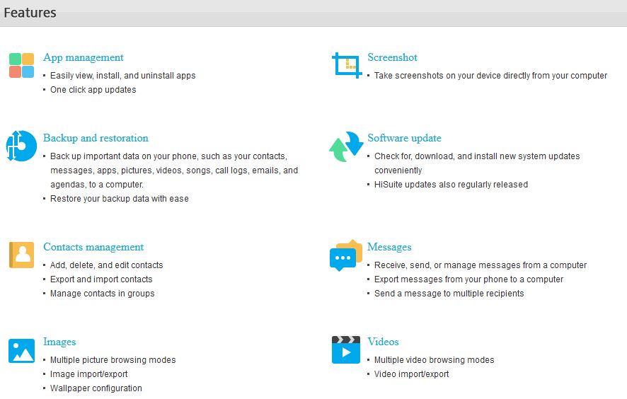 اولین قابلیت برنامه HiSuite، امکان مدیریت گوشی از طریق کامپیوتر است. شما میتوانید بر روی کامپیوتر شخصی خود به پیامها، مخاطبین، تصاویر، ویدئوها و برنامههای موجود بر روی حافظه دسترسی پیدا کنید.