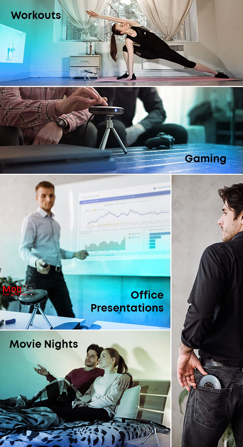همانطور که در تصاویر مشاهده می کنید این محصول طراحی دایره ای دارد و شبیه یک دیسک به نظر می رسد که امکان حمل آنرا آسان می کند. پروژکتور قابل حمل قابلیت نمایش تصاویر باکیفیت 1080 پی و قدرت نور 200 لومن را بر یک سطح 240 اینچی دارد که این برای تماشای فیلم فوق العاده لذت بخش به نظر می رسد. فناوری ویرایش اتوماتیک زاویه نمایش نیز امکان انتخاب بهترین شرایط نمایش را فراهم می کند.