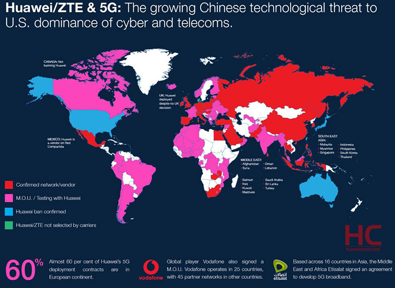 نقشه فوق نشاندهنده کشورهایی است که برای پیادهسازی زیرساختهای 5G از تجهیزات هوآوی استفاده میکنند. این کشورها عبارتاند از: بریتانیا، آلمان، ایتالیا، موناکو، اسپانیا، سوییس، ایرلند، پرتغال، هلند، فنلاند، یونان، قبرس، اتریش، رومانی، مجارستان، روسیه، ترکیه، سوئد، امارات متحده عربی، عربستان سعودی، مکزیک، فیلیپین و کره جنوبی.