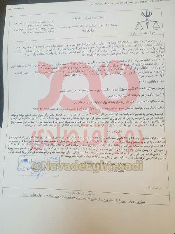 شعبه ۲۹ دیوان عدالت اداری دستور موقت توقف اجرای مصوبه کمیسیون تنظیم مقررات وزارت ارتباطات را به نفع اپراتور رایتل صادر کرد.