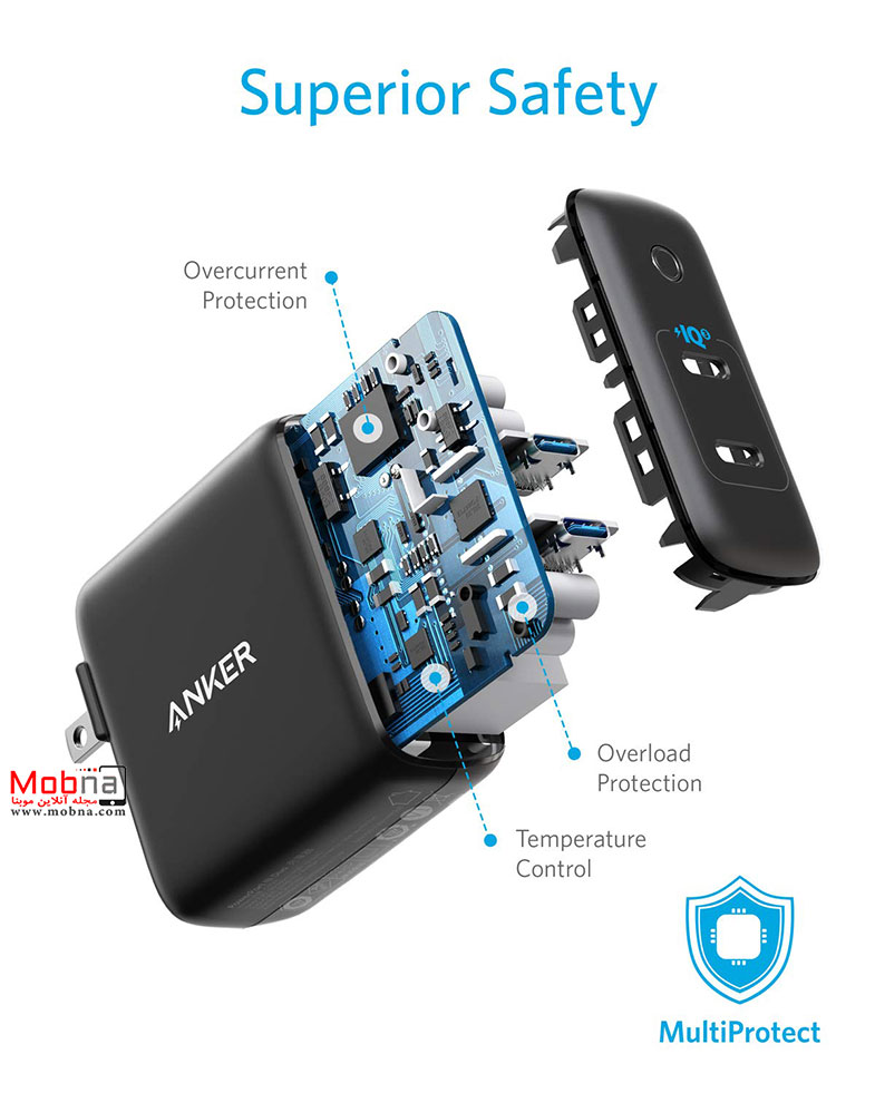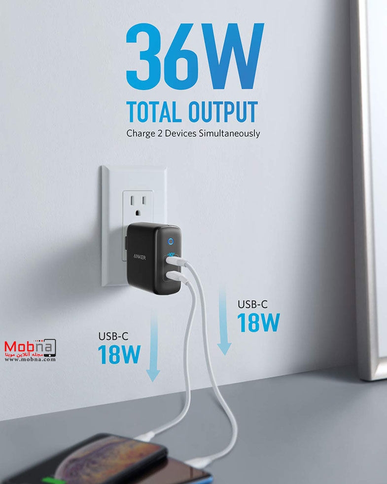 این محصول دارای دو پورت یو اس بی تایپ-سی با مجموع خروجی 36 وات است که از فناوری پاور آی کیو 3.0 پشتیبانی می کند. با این فناوری می توانید دو دستگاه را بطور همزمان بدون افت کیفیت شارژ کنید. در ساختار آن نیز از فناوری مالتی پروتکت انکر استفاده شده که از گجت ها برابر تغییرات جریان محافظت می کند.