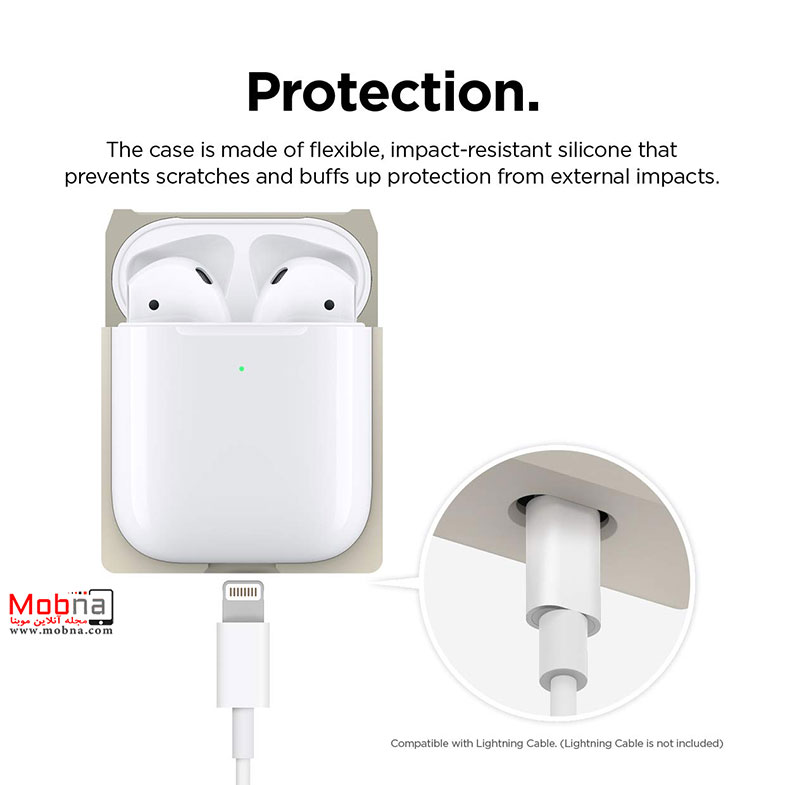 این قاب در ابعاد 24.5 در 57  در 47.5 میلیمتر تولید شده و همانطور که در تصاویر مشاهده می کنید از سیلیکون بسیار باکیفیتی تهیه شده است. آیپادز با کیس اصلی خود درون این قاب قرار می گیرد و چراغ نشانگر شارژ را نیز می توان مشاهده کرد. با حذف بخش مربوط به ایرپادز می توانید اپل واچ خود را نیز داخل این قاب قرار داده و شبیه پایه از آن استفاده کنید.