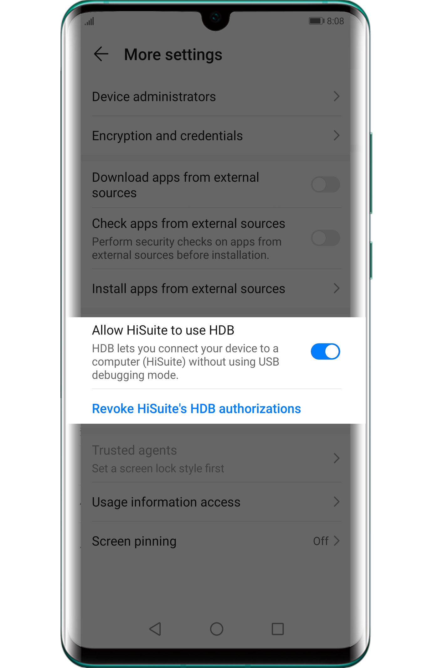- در صورتی که این پیام بر روی گوشی شما ظاهر نشد، با رفتن به بخش تنظیمات، گزینه HDB را از طریق بخش جستجو، پیدا کنید. این تنظیمات در قسمت امنیت (Security) قرار گرفته است.