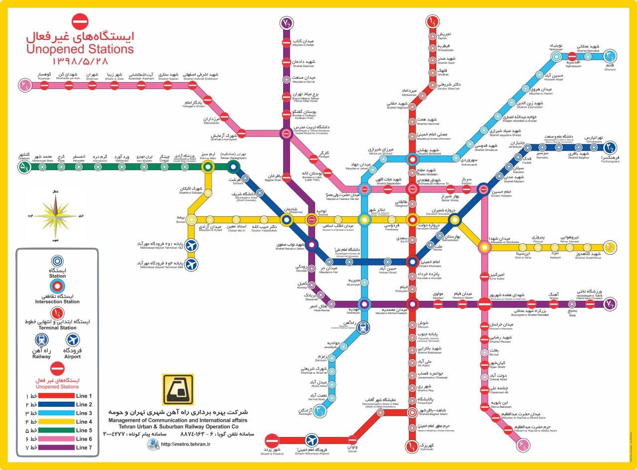 نقشه جدید و کامل خطوط 1 تا 7 مترو تهران/ نقشه کامل مترو تهران شامل ۷ خط با ۱۴۳ ایستگاه است. از این میان ۱۸ ایستگاه در محل تقاطع خطوط قرار دارند.