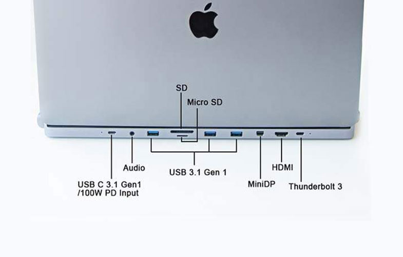 دی جی رول نیز از آلومینیوم تراش خورده با ماشین سی ان سی شکل گرفته و مقاومت بالایی در برابر فشار دارد. در دو رنگ هماهنگ با مک بوک پرو ارائه می شود. تعداد پورت های اضافه شده را می توانید در تصویر زیر مشاهده کنید.