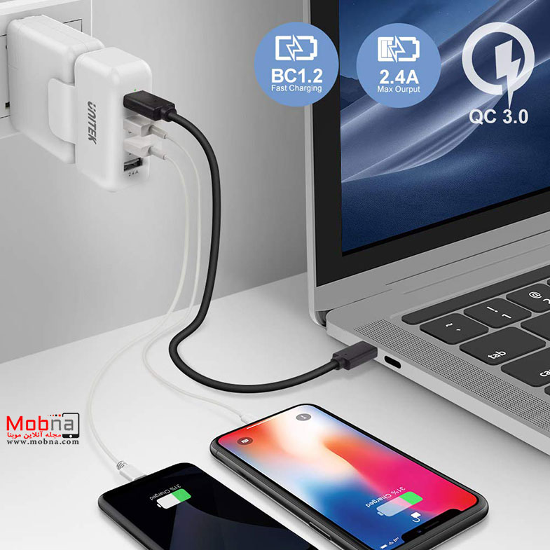 اما ویژگی اصلی این شارژ دیواری افزودن 3 پورت شارژ یو اس بی و یک پورت تایپ-سی به اداپتور اصلی مک بوک است زیرا با یک گیره خلاقانه به اداپتور مک بوک متصل می شود. یکی از پورت های یو اس بی نیز از فناوری شارژ سریع3.0 پشتیبانی می کند. و دو پورت دیگر هر کدام 2.4 امپر خروجی دارند. پورت تایپ-سی نیز 45 وات برق رسانی دارد که برای شارژ مک بوک استفاده می شود.