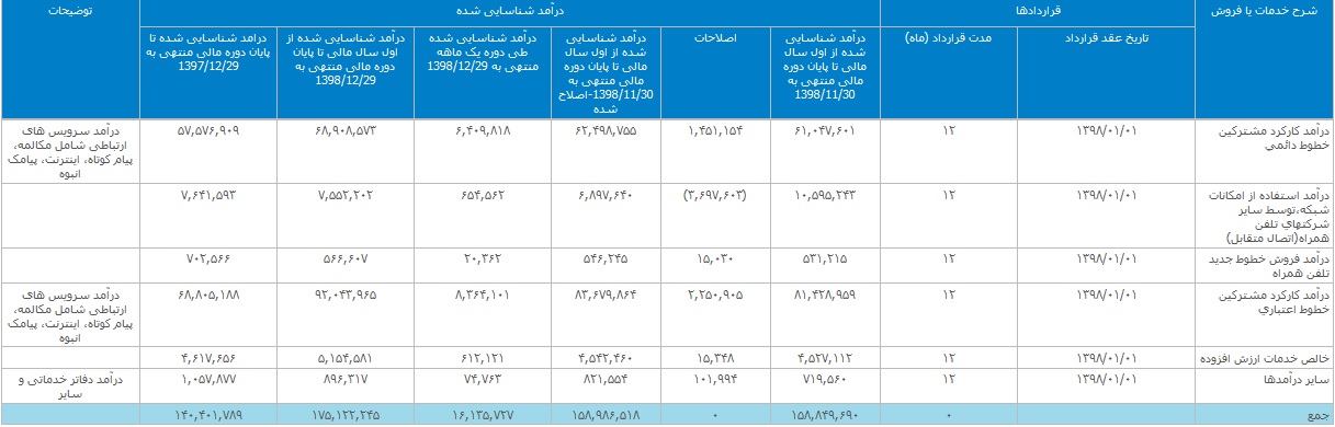 این شرکت در عملکرد 12 ماهه 17.5 هزار میلیارد تومان درآمد داشته که نسبت به مدت مشابه سال قبل 25 درصد رشد داشته است. بیشترین درآمد کسب شده طی دوره اسفند از کارکرد مشترکین خطوط اعتباری به میزان 836.4 میلیارد تومان (معادل 52 درصد درآمد) و کارکرد مشترکین خطوط دائمی بالغ بر 640.9 میلیارد تومان بوده (معادل 40 درصد درآمد) است.