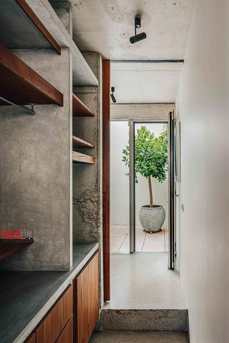 فلز، چوب، شیشه و بتن مواد اصلی تشکیل دهنده نمای داخلی پروژه هستند. روی دیوارها نیز تصاویری از وضعیت قبلی خانه در حالت سیاه و سفید تبدیل به تابلو شده اند.