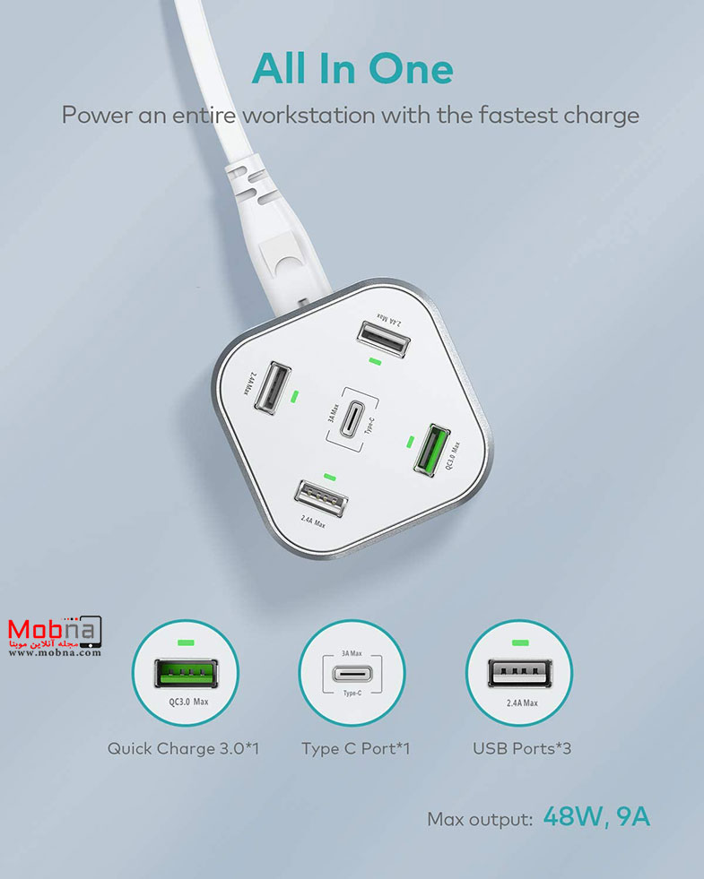 پورت تایپ-سی 3 آمپر خروجی دارد و یکی از پورت های یو اس بی از استاندارد شارژ سریع 3.0 پشتیبانی می کند.
