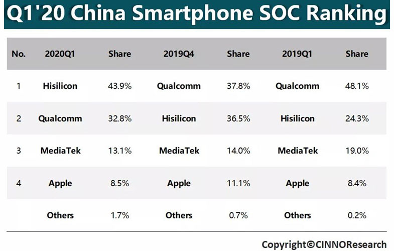بر اساس گزارشهای منتشر شده در سه ماهه اول سال ۲۰۲۰ میلادی، HiSilicon موفق شده ۲۲.۲۱ میلیون پردازنده ویژه گوشیهای هوشمند را به بازار عرضه کند. این آمار و ارقام توسط شرکت تحقیقاتی CINNO و در جدیدترین گزارش ماهیانه از وضعیت صنعت تولید نیمههادی در چین منتشر شده است. HiSilicon در سهماهه اول سال گذشته میلادی ۲۲.۱۷ میلیون پردازنده مخصوص گوشیهای هوشمند تولید کرده بود. اگرچه این رقم افزایش جزئی میزان تولیدات این شرکت را در مقایسه با سال گذشته میلادی نشان میدهد اما از این جهت اهمیت دارد که HiSilicon را به تنها برند این بازار تبدیل کرده که در مقایسه با سال قبل میزان تولیدش کاهش نداشته است.