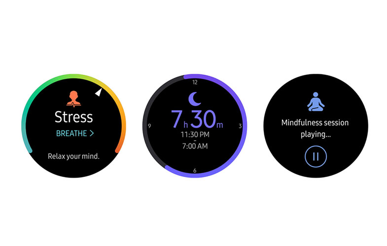 کاربرانی که ساعت هوشمند گلکسی واچ سامسونگ را در اختیار دارند میتوانند از قابلیتهای سازگاری این ساعت با اپلیکیشن Samsung Health بهره ببرند. این دسته از کاربران میتوانند پخش یا قطع صداها و تمرینات مدیتیشن و مراقبه را با ساعت خود کنترل کنند و البته به کمک سنسورهای ساعت هوشمند گلکسی واچ میزان استرس خود را اندازهگیری و روی آن نظارت داشته باشند.