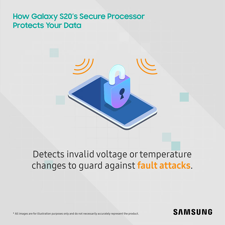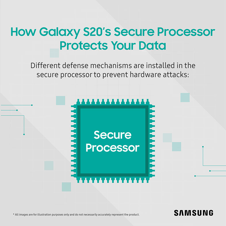 پردازنده امن گلکسی S20 راهکار سامسونگ برای مقابله با این حملات سختافزاری است. آن قطعه سختافزاری هم یک چیپ فیزیکی است که فضایی مجزا را برای نگهداری دادههای محرمانه در دستگاه تامین میکند. علاوه بر تفکیک و کدگذاری مداوم دادههای محرمانه، این چیپ از یک محافظ فیزیکی هم برای حراست در برابر حملات فیزیکی استفاده میکند. این قطعه همچنین میتواند تغییرات مشکوک دما یا ولتاژ را شناسایی کند و مجهز به الگوریتمی امنیتی است که حملات کانال جانبی را هم ناکام میگذارد.