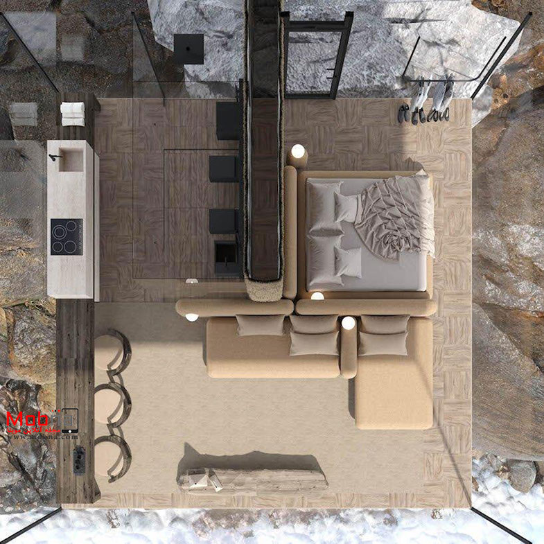 این کابین روی یک صخره و لبه پرتگاه قرار گرفته و تمام اطراف آن شیشه کار شده است. برای این اتاق 48 متر مربعی یک ستون با پوشش موکت نیز در نظر گرفته که همانند ستون خانه عمل می کند.