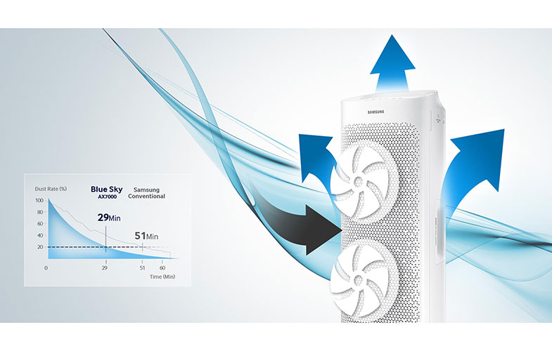 این فناوری در سری جدید دستگاههای تصفیه هوا و کولرهای گازی سامسونگ وجود دارد. فناوری مذکور در دستگاههای تصفیه هوا با دریچه مکش هوای تعبیه شده در جلو به آسانی هوا را به داخل میکشد و به کمک فنهای دوقدرته با دو سیستم فیلتراسیون ۵ مرحلهای هوا را با قدرت تصفیه میکند و هوای پاک را با جریان هوا در سه جهت در محیط توزیع میکند. «نمایشگر پاکی هوا» با وجود ۳ حسگر باعث میشود که میزان دقیق مقادیر ذرات معلق 2.5 و 10 میکرومتری مشخص شود و چراغهای رنگی مختلف میزان گازهای مضر را به نمایش میگذارد. ازجمله پیشرفتهترین محصولات تصفیه هوای سامسونگ، دستگاه AX7000 است که میتواند ظرف مدت یک ساعت 93 مترمربع از فضا را پوشش دهد.
