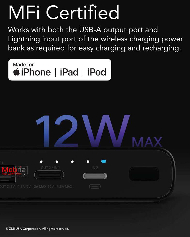 پورت تایپ-سی از جریان ورودی نیز پشتیبانی می کند و برای شارژ خود پاوربانک قابلیت استفاده دارد. همچنین یک پورت لایتنینگ 12 واتی ورودی نیز روی بدنه پاوربانک قرار داده شده است.