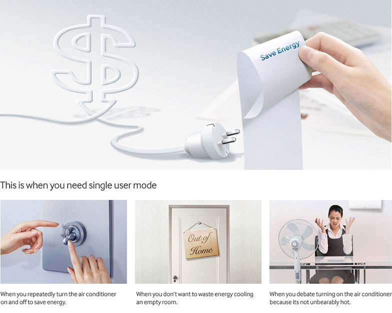 این بخش موردعلاقه پدرهاست! دیگر نیازی نیست منتظر یک وزش باد باشید تا بگویید هوا خنک شده و نیمه شب از خواب بپرید و به دفعات کولر را خاموش و روشن کنید تا به این بهانه در مصرف انرژی صرفه جویی کنید. با فعال کردن حالت«تک‌کاربره»، کمپرسور و فن تنها در مدت زمان لازم کار می‌کنند تا دمای مطلوب هوا را حفظ کنند و در صورت عدم ضرورت، خاموش می‌شوند. بنابراین مصرف برق به کمترین میزان ممکن می‌رسد، مبلغ قبض برق کاهش می‌یابد و درعین حال منزل شما همیشه خنک است.