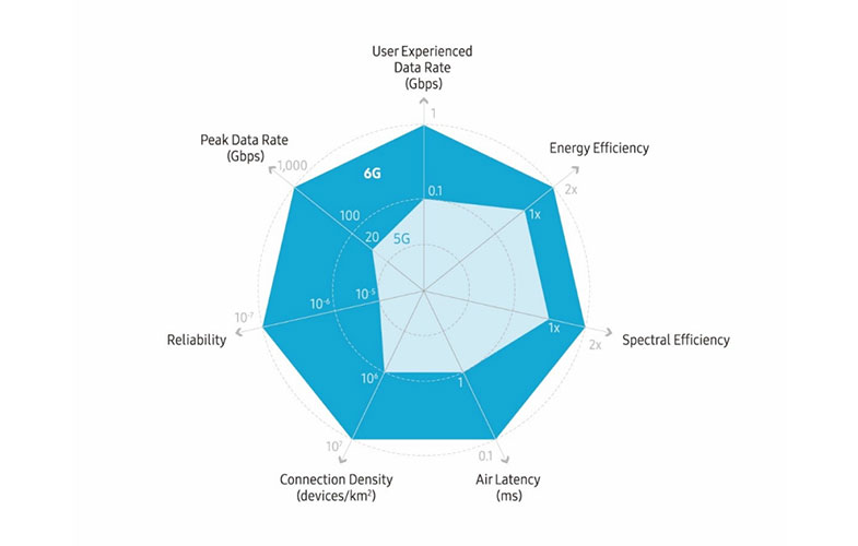 در حالی که مقتضیات فناوری نسل پنجم یا 5G غالبا حول بهبود عملکرد مطرح میشدند اما سامسونگ سه دسته مقتضیات برای رسیدن به خدمات 6G مطرح کرده است که همه حوزههای عملکرد، معماری و قابل اتکا بودن را شامل میشود. از جمله مقتضیات در حوزه عملکرد میتوان به حداکثر نرخ انتقال داده با سرعت هزار گیگابایت بر ثانیه و تاخیر هوایی کمتر از 100 میکروثانیه اشاره کرد که تا 50 برابر بیشتر از حداکثر نرخ انتقال داده 5G و تاخیری تا یک دهم کمتر از آن فناوری است. مقایسه مقتضیات کلیدی میان فناوریهای 5G و 6G در نمودار زیر به نمایش درآمده است.