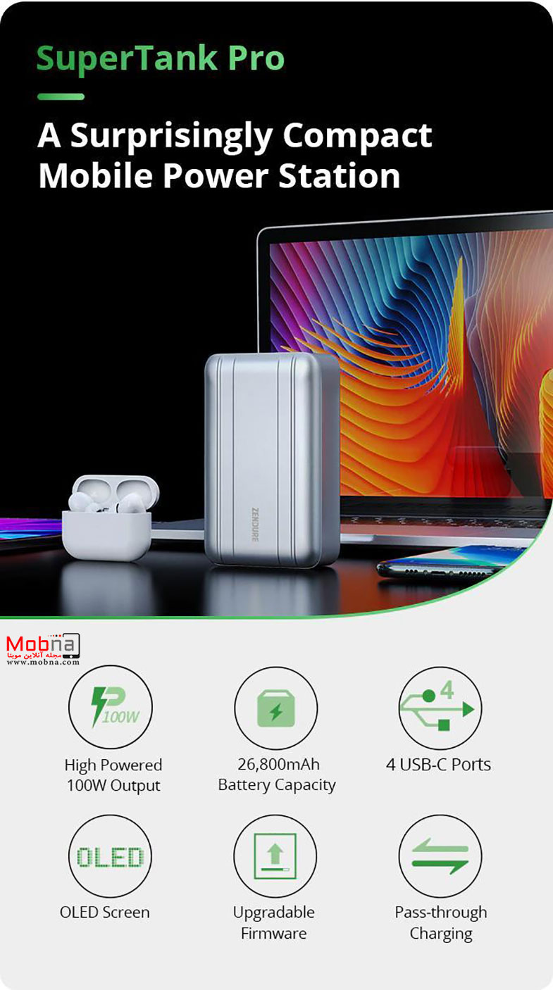 سوپرتانک از یک باتری داخلی قابل شارژ 26800 میلی آمپری استفاده می کند و روی بدنه آن 4 پورت یو اس بی-سی قرار گرفته است که در یک زمان 4 گجت را شارژ خواهد کرد.