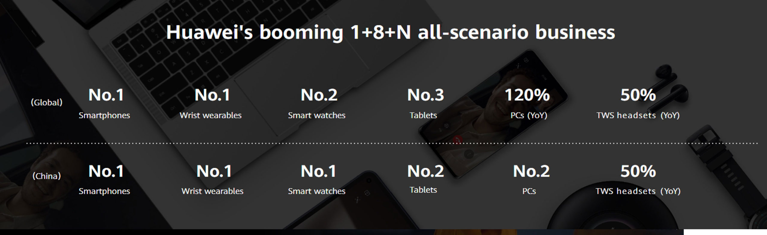 امسال هوآوی در سهماهه دوم سال، موفق به کسب رتبه نخست بیشترین تعداد فروش گوشی هوشمند و گجتهای پوشیدنی در دنیا شد تا استراتژی 1+8+N خود را بیش از پیش عملی کند.