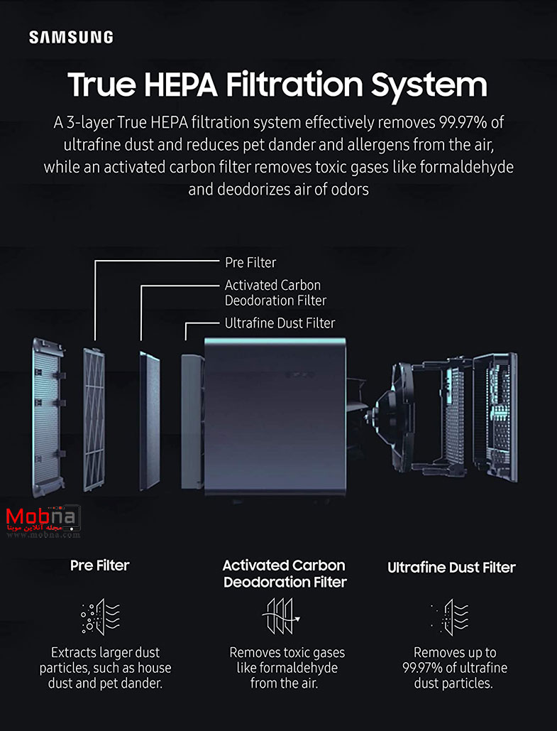 در این محصول از 3 فیلتر هپا استفاده شده که حدود 100 درصد هوای محیط را فیلتر می کند. بدین مفهوم که گرد و غبار، عوامل آلرژی زا در محیط تا 99.97 درصدحذف خواهند شد. گفتنی است این بهبود دهنده بسیار آرام و بی صدا فعالیت می کند.