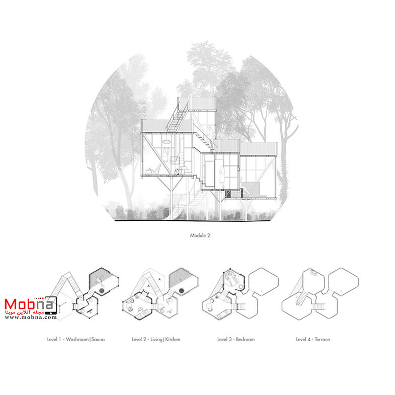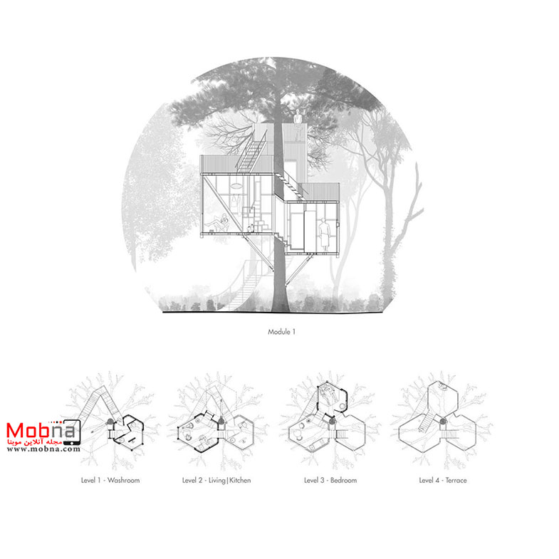 مجله آنلاین موبنا؛ محمدمهدی حیدرپور – تصاویری که در ادامه مشاهده می کنید مربوط به طرح مفهومی خانه های درختی می شود که توسط استودیو شانیل فرانسه متشکل از دو معمار جوان ارائه و در چندین رویداد بین المللی جز فینالیست ها بوده است.