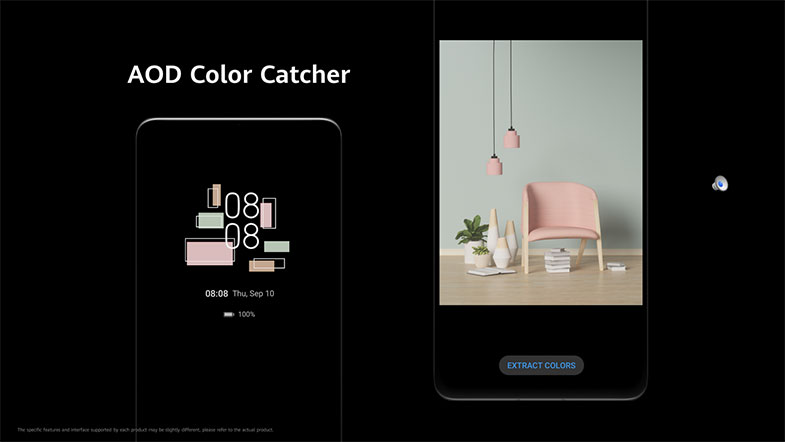 المانهای پایهای طراحی عبارتند از فضا، شکل و رنگ که در طراحی قابلیت صفحهنمایش همیشه روشن (AOD) این المانها به خوبی رعایت شده است. در حالت پیشفرض در این قابلیت از سه رنگ اصلی قرمز، آبی و زرد استفاده شده، اما امکان انتخاب هر رنگی توسط کاربران وجود دارد. حتی میتوانید ظاهر و رنگ گوشی خود را با لباسهای هر روزتان هماهنگ کنید.