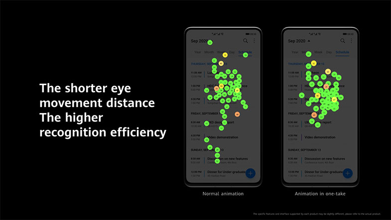 برای مثال بر اساس تحقیقات، مشخص شده که کاربر در زمان تغییر صفحه تمایلی به جابهجایی زیاد چشم خود ندارد. بر اساس همین داده، افکتهای تغییر صفحه در EMUI 11 بهگونهای طراحی شده که میزان زیادی از محتوای صفحهبعد را نیز هنگام جابهجایی به نمایش میگذارد. در این شیوه کاربر بدون جابهجایی زیاد چشم، از اطلاعات صفحه بعد نیز مطلع میشود.
