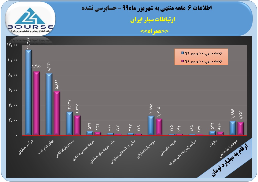 شرکت ارتباطات سیار ایران در ۶ماهه منتهی به شهریور ١٣٩٩ مبلغ ٩٨٧ ریال به ازای هر سهم سود محقق کرده است که ٨ درصد نسبت به دوره مشابه سال گذشته رشد داشته است. گفتنی است در این دوره درآمد های عملیاتی ٣۴ درصد نسبت به دوره مشابه سال گذشته رشد داشته است .