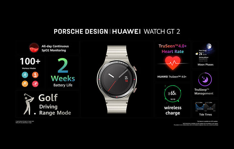 یکی از این ویژگیهای جدید این ساعت هوشمند داشتن حالت مخصوص برای ورزش گلف است. حالت گلف میتواند طرز ایستادن و ضربههای کاربر به توپ را ارزیابی کند و توصیههایی را برای بهبود ضربهها به کاربر ارایه دهد. همچنین بیشتر از ۱۰۰ حالت برای نرمش و ورزش، مانیتورینگ خواب و کنترل سطح استرس برای این ساعت در نظر گرفته شده است. یک بارومتر داخلی برای تشخیص ارتفاع در ساعت Porsche Design Huawei Watch GT2 به کار رفته که تغییرات ناگهانی فشار هوا را اندازه میگیرد و هشدارهایی لحظهای دربارهی وضعیت آب و هوا ارایه میدهد.