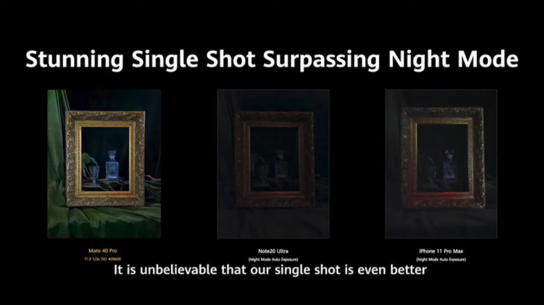 برای مثال در جریان مراسم رونمایی از گوشیهای سری میت ۴۰ نشان داده شد که در عملیات Single Shot تحت نور محیطی بسیار کم، تصویر ثبت شده در مقایسه با دیگر پرچمداران بازار به وضوح با کیفیتتر و روشنتر است.