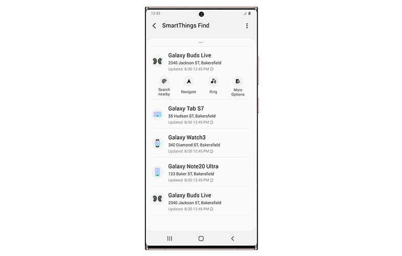 وقتی روند کوتاه ثبت نام در SmartThings را کامل کنید، این خدمات میتواند به یافتن گوشیهای هوشمند، تبلت و ساعت هوشمند و حتی دستگاههای کوچکتری مانند هدفونها هم به شما کمک کند. چه گوشی نوت 20 اولترای خود را روی کاناپه خانه جا گذاشته باشید، هدفون گلکسی Buds Live را روی یکی از میزهای دفتر کارتان جاگذاشته باشید یا ساعت هوشمند گلکسی Watch 3 را در جایی آنقدر مطمئن گذاشته باشید که حتی خودتان هم یادتان نمیآید کجا بود، اینجاست که SmartThings Find به کمک شما میآید تا براحتی محل آنها را پیدا کنید.