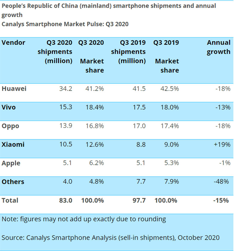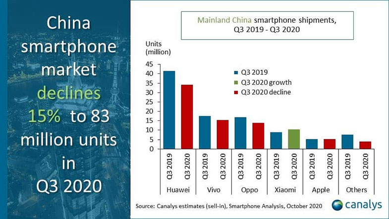 ۵ تولیدکنندهی برتر در چین، مجموعا ۹۵.۲ درصد از سهم بازار را در اختیار دارند. مجموع دستگاههای عرضهشده به بازار از سوی این شرکتها به عدد ۷۹ میلیون دستگاه میرسد. در تحلیلهای موسسهی Canalys میتوان افت ۸ درصدی بازار گوشیهای هوشمند در چین را نسبت به ۳ ماههی گذشته مشاهده کرد. اگر بخواهیم این موضوع را نسبت به سال گذشته بسنجیم، شاهد افتی ۱۵ درصدی را در این بازار خواهیم کرد. در ۳ماههی سوم سال ۲۰۲۰ مجموعا ۸۳ میلیون دستگاه گوشی هوشمند در بازار چین عرضه شده است.