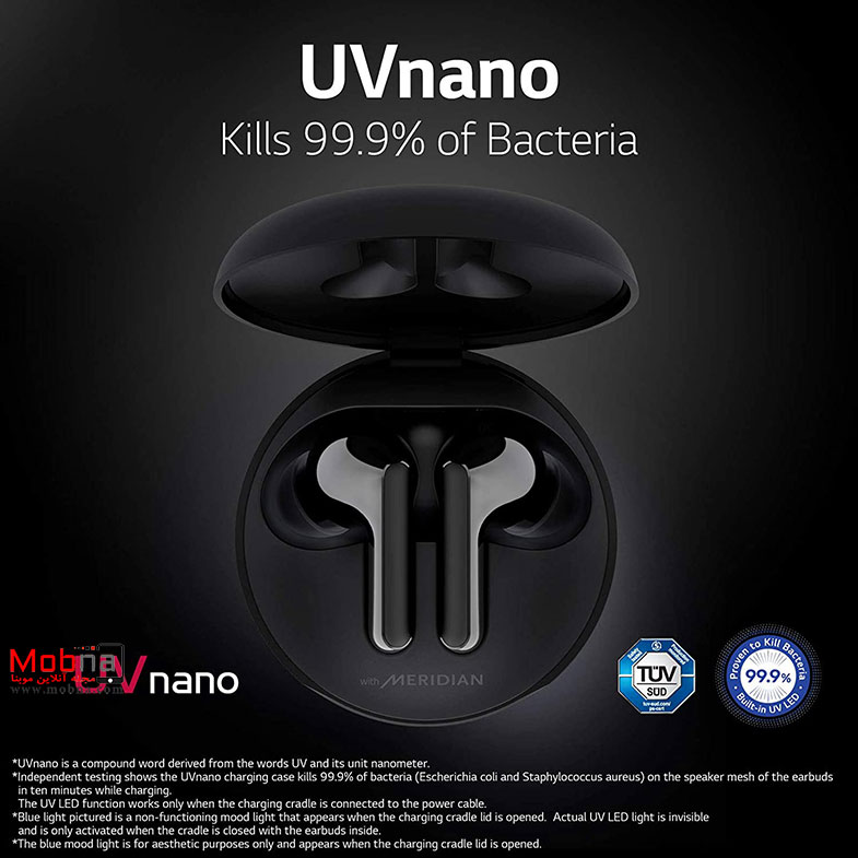 ال جی در تولید این محصول با برند بسیار معتبر و حرفه ای مریدین اودیو همکاری داشته تا کیفیت صدای خروجی محصول را تضمین کند. جعبه شارژ این هدفون نیز مجهز به یو ویی نانو است که 99.99 درصد باکتری های مضر را طی 10 دقیقه از بین می برد.
