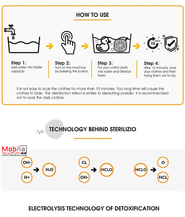 با این ابعاد جمع و جور استفاده از آن در هر مکانی امکان پذیر خواهد شد. وقتی که ماشین لباسشویی را روشن می کنید می تواند یک میدان الکتریکی ایجاد کند تا مولکول های آب در آن میدان الکترولیز شوند و یون های هیدروکیسل تشکیل شده و بطور موثر آب را از باکتری ها و ویروس ها طی 15 دقیقه پاکسازی می کنند.