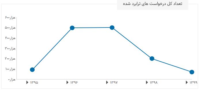 همانطور که در تصویر بالا قابل مشاهده است، تعداد کل درخواستهای ترابرد در هر سه اپراتور از پایان سال 1397 روندی کاهش داشته است؛ بهطوریکه این روند در سال گذشته نیز نزولی بوده و در نهایت در سال جاری نیز به کمتر از یکصد هزار ترابرد تقلیل یافته است. اگر روند فعلی ادامه داشته باشد، میتوان انتظار داشت این نمودار در پایان سال به کمتر از 50 هزار ترابرد کاهش یابد.