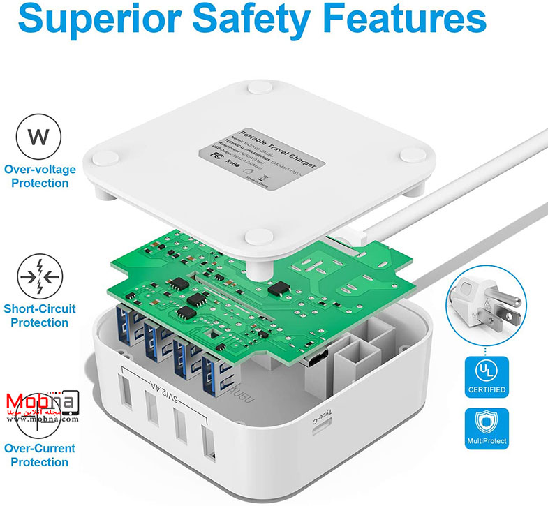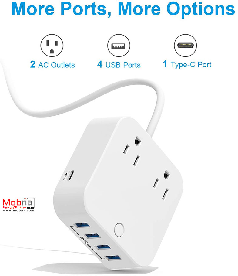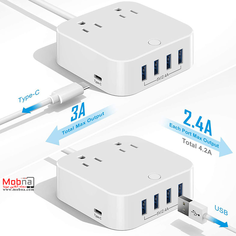 روی بدنه این محصول دو پورت AC نیز مشاهده می شود. پورت های یو اس بی مجموعا 2.4 امپر خروجی دارند پورت تایپ-سی نیز 3 امپر خروجی دارد. با این گجت براحتی می توان 5 دستگاه را همزمان شارژ کرد.