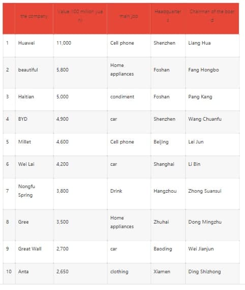 نکته جالب این لیست فاصله زیاد هوآوی با شرکت دوم لیست است. در این لیست کمپانی سازنده لوازمخانگی Midea Group با ارزشی برابر با 580 میلیارد یوآن در رتبه دوم قرار داشته و شرکت Haitian international با 500 میلیارد یوآن و BYD (Build your Dreams) با 490 میلیارد یوآن ارزش در رتبههای بعدی قرار دارند.