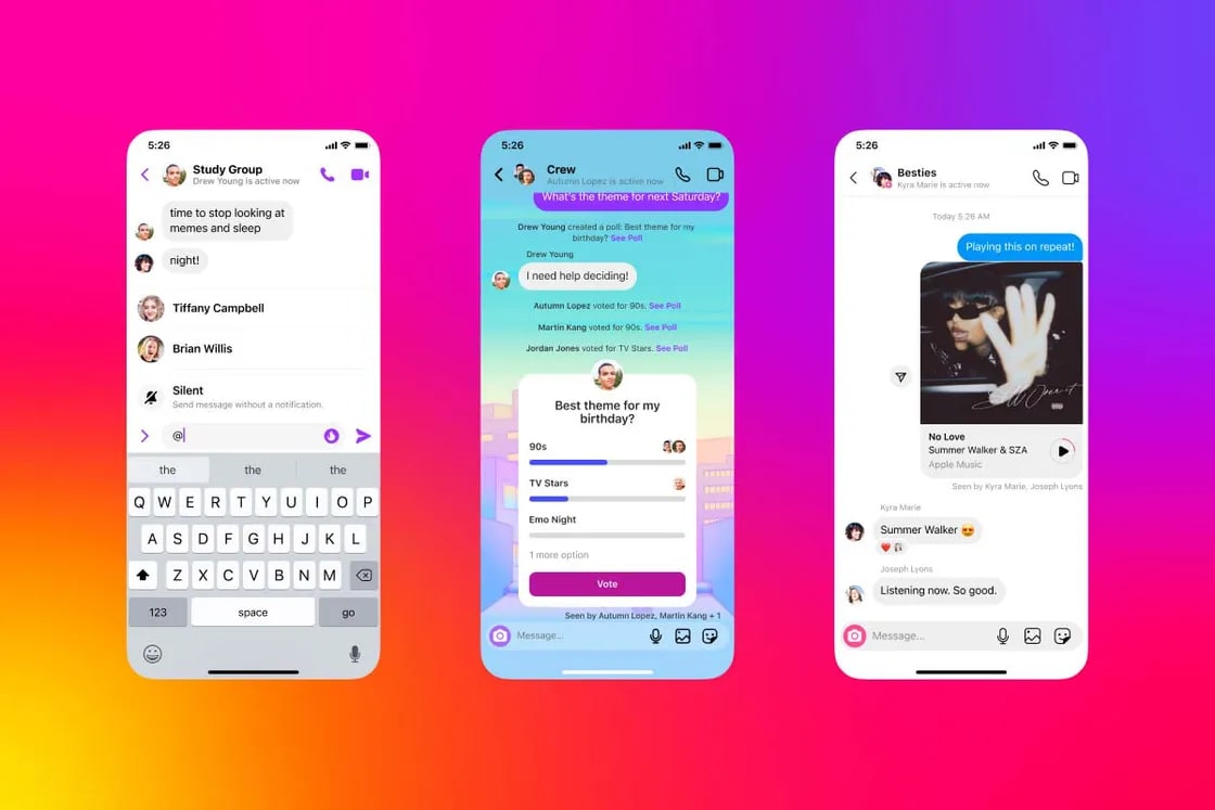 اینستاگرام همچنین پشتیبانی از دستور @Silent را به اپلیکیشن خود اضافه کرده که با استفاده از آن پیامها در گروهها بدون نوتیفیکیشن برای سایر کاربران ارسال خواهد شد. هنوز مشخص نیست که شبکه اجتماعی متعلق به متا قصد دارد در آینده از دستورهای بیشتری استفاده کند یا خیر. در نهایت، گروهها به قابلیت استفاده از نظرسنجی نیز مجهز شدهاند که قبلا کاربران میتوانستند در استوریهای خود از آنها استفاده کنند.
