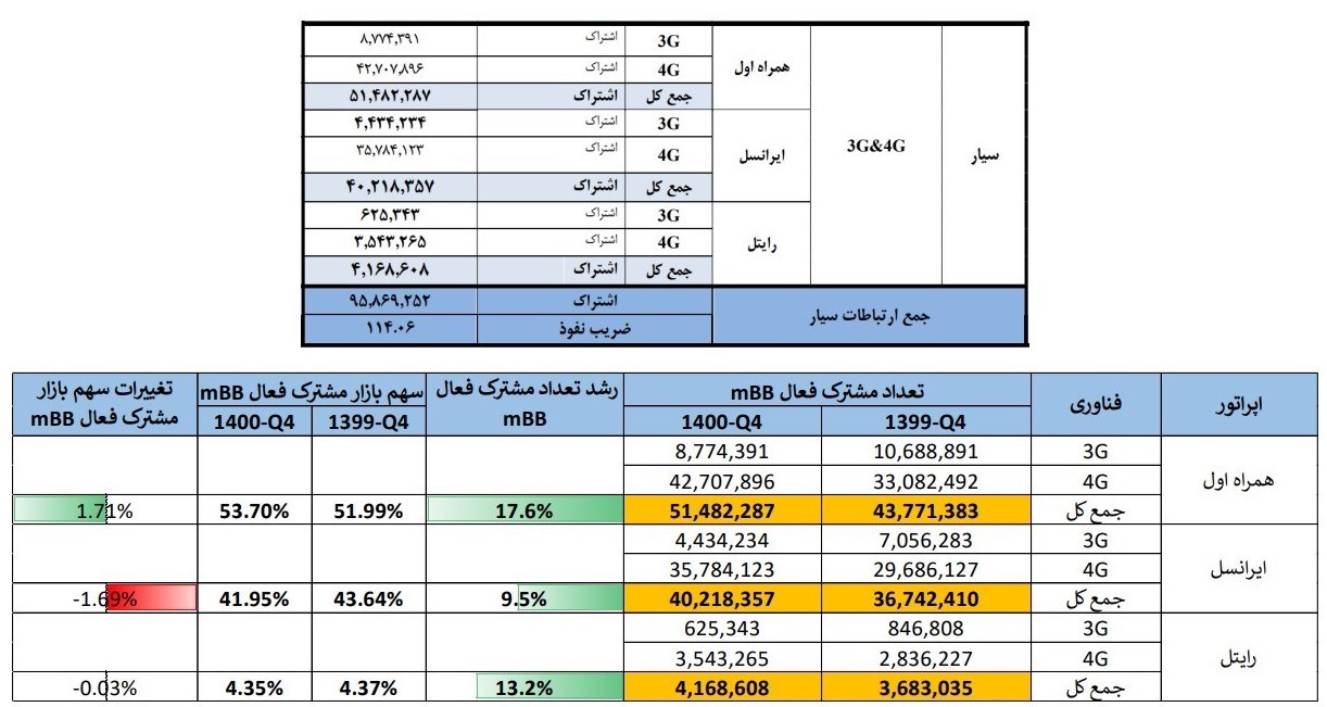 با این حال ممکن است آمار مربوط به مقایسه سهم بازار در بازههای کوتاه مدت نیز برای عدهای جذاب باشد؛ برای این موضوع به مقایسه سهم بازار این سه اپراتور در سه ماهه سوم و چهارم سال 1400 نیز پرداختیم که نتایج آن به شرح جدول زیر است: