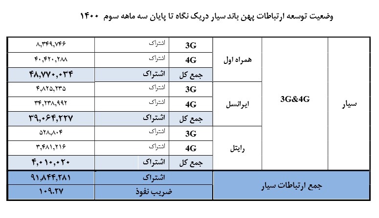 لازم به ذکر است که تا پایان سه ماهه سوم سال 1400 یعنی تا پایان پاییز، تعداد اشتراک تلفن همراه نزدیک به 92 میلیون و ضریب اشتراک حدود 109 درصد بود.