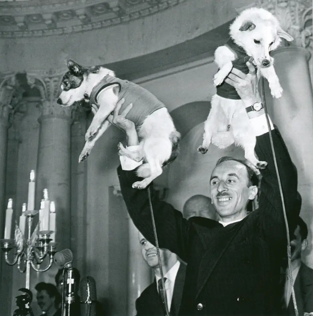 در این عکس که در سال 1960 گرفته شده است، دکتر اولگ گازنکو مدیر موسسه مشکلات بیومدیکال روسیه، دو سگ به نام های بلکا و استرلکا را در دستان خود نگه داشته است. بلکا و استرلکا نخستین سگ هایی بودند که از یک سفر فضایی جان سالم به در بردند.