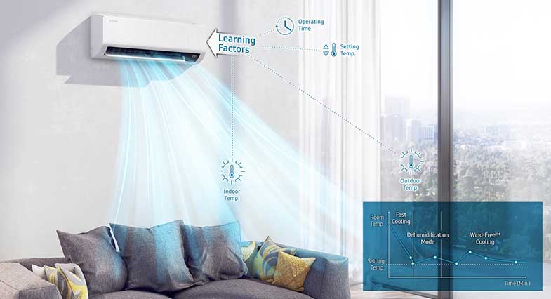 در گرمای تابستان کار با یک دستگاه خنککننده معمولی نسبتا ساده است. دکمه روشن را فشار میدهید و صبر میکنید تا هوای محیط سرد شود. زمانی که احساس سرما کردید، دستگاه را خاموش میکنید یا جهت آن را به سمت بالا یا پایین تغییر میدهید. اما کولرهای گازی مجهز به فناوری Wind Free سامسونگ کارها را به شکلی رضایتبخش و متفاوت انجام میدهد. فناوری AI Auto Comfort قابلیت قابل توجه تهویه مطبوع Wind Free سامسونگ است. این فناوری هوشمند برای سادهتر و کارآمدتر کردن زندگی، شرایط اتاق و الگوهای استفاده را تجزیه و تحلیل میکند. بر اساس ترجیح شما و دمای بیرون، به طور خودکار دما را برای بهینهسازی شرایط آب و هوایی اتاق تنظیم کرده و راحتی کامل را در همه حال تضمین میکند. به خاطر داشته باشید برای فعال سازی عملکرد AI Auto Comfort، علاوه بر اتصال Wi-Fi، به یک حساب کاربری در برنامه Samsung SmartThings نیاز دارید.