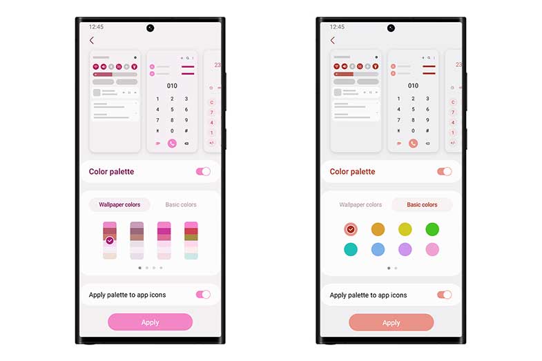بهروزرسانی One UI 5 روشهای جدیدی را برای شخصیسازی تجربه کاربر از گوشیهای هوشمند در اختیار آنها قرار میدهد که شامل تنوع بیشتر رنگ برای شخصیسازی گوشی میشود. متناسب با تصویر پسزمینه انتخاب شده توسط کاربر، در رابط کاربری جدید تا 16 تم رنگی مختلف و 12 رنگ جدید برای استفاده در صفحه اصلی، آیکونها و پنل دسترسی سریع، در اختیار کاربر قرار میگیرد تا گوشی را مطابق سلیقه خود تنظیم کند.