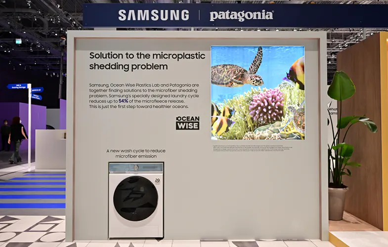 تخمین زده میشود که کف اقیانوس به تنهایی در حال حاضر خانه بیش از 14 میلیون تن میکروپلاستیک است که 35 درصد آنها از شستشوی لباسهای ساختهشده از الیاف مصنوعی به دست میآیند. یک مطالعه از صندوق جهانی حیات وحش تخمین میزند که انسانها هر هفته معادل یک کارت اعتباری، پلاستیک را از طریق هوایی که تنفس میکنند و آبی که مینوشند، میخورند. سامسونگ برای مقابله با این رویه نامطلوب، ساخت ماشین لباسشویی کاهنده میکروپلاستیک را آغاز کرد. سامسونگ در سال 2022 و با همکاری برند جهانی Patagonia و آزمایشگاه Ocean Wise Plastics محصولی را معرفی کرد که فرآیند ریزش میکروپلاستیک در چرخه شستوشو را تا 54 درصد کاهش میدهد.